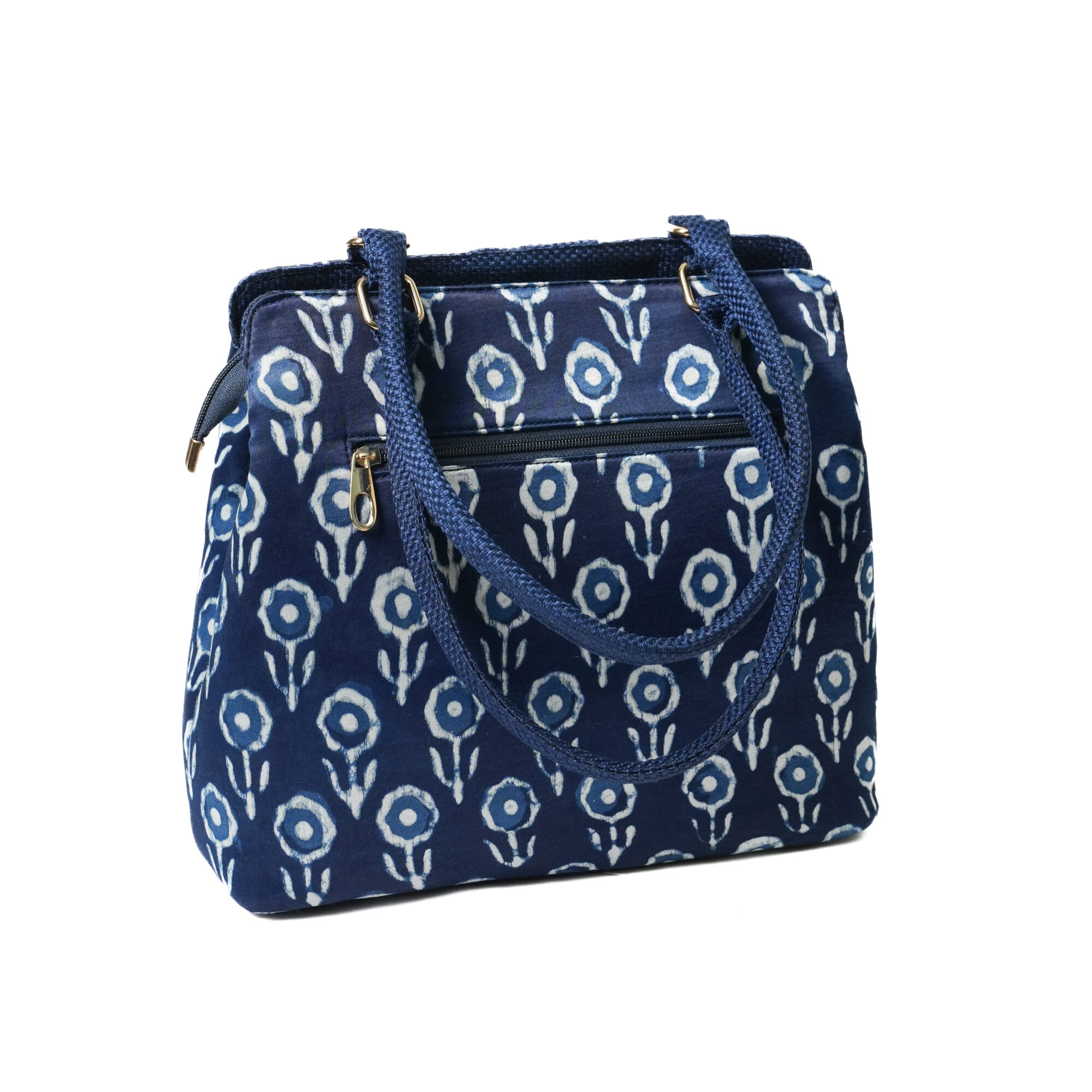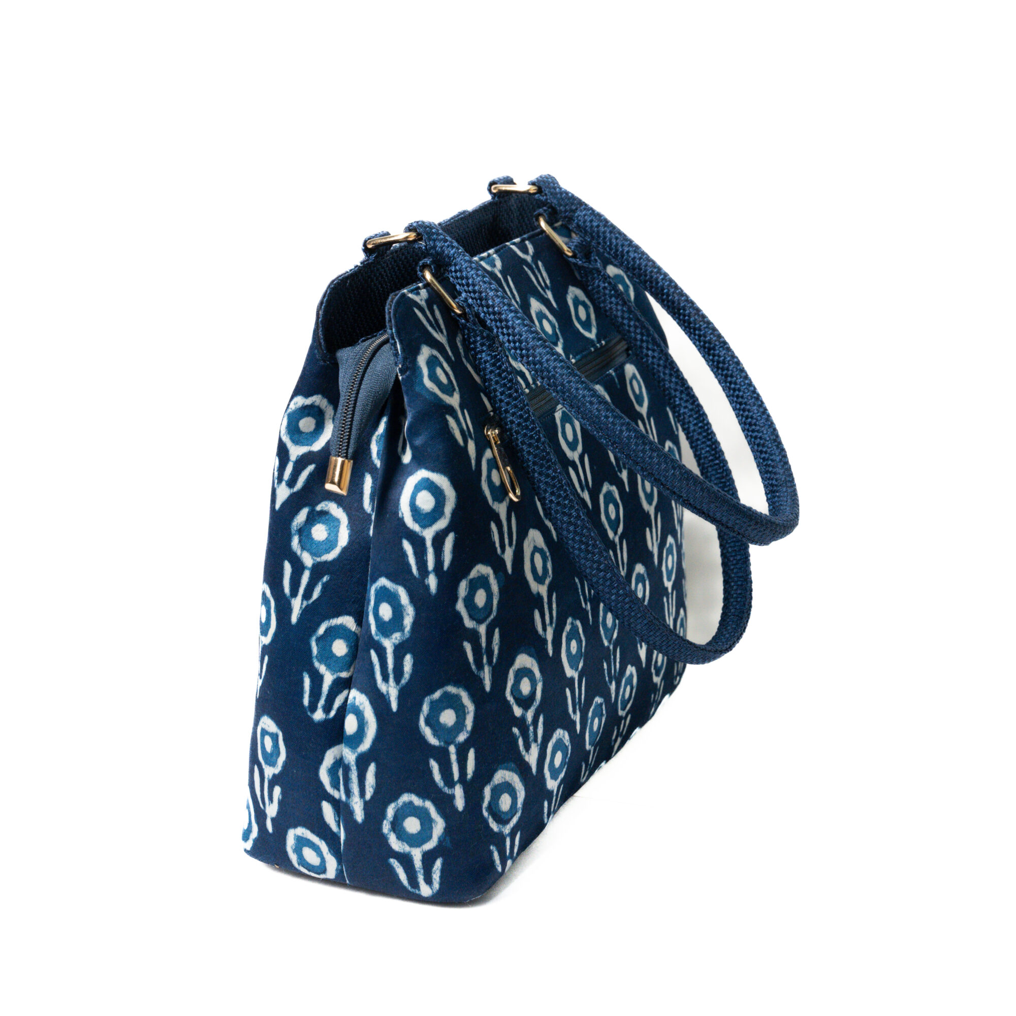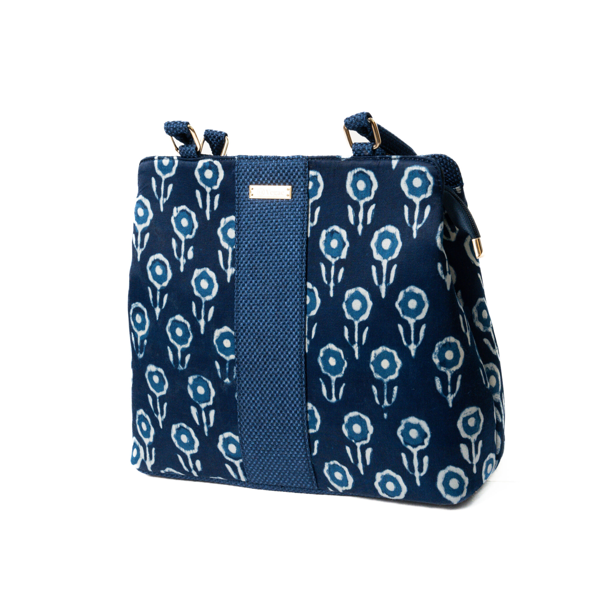 Multi color Block Mashru & Superfine Jute Handbag – Indigo Blue