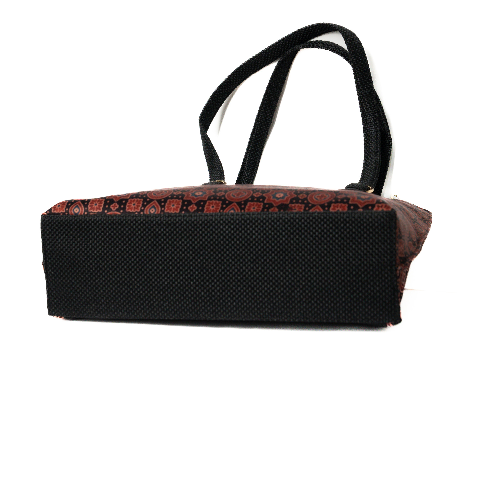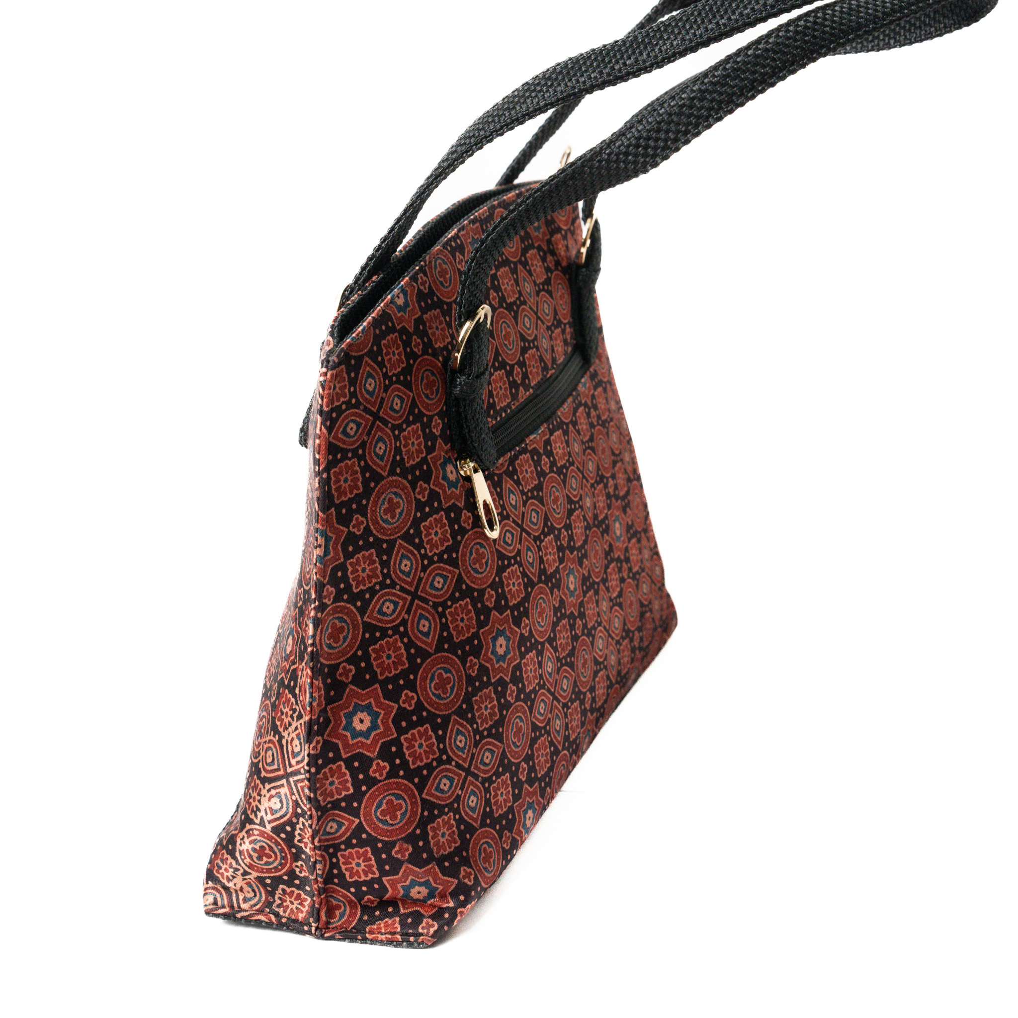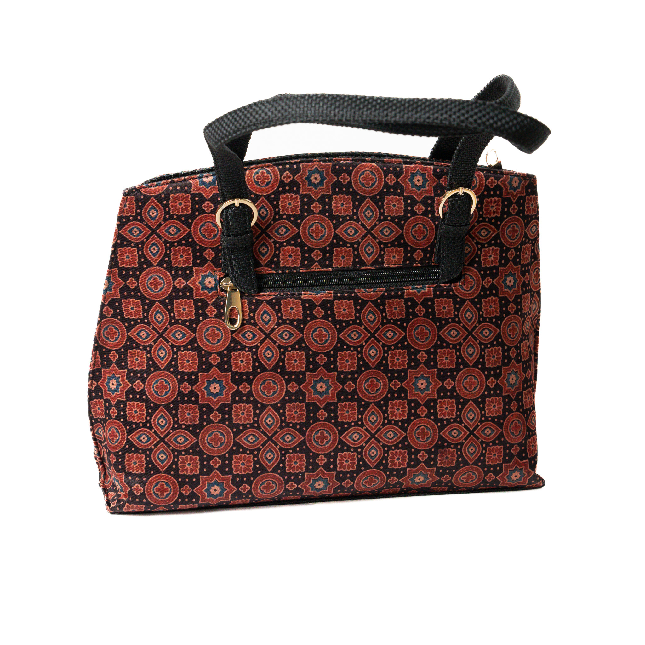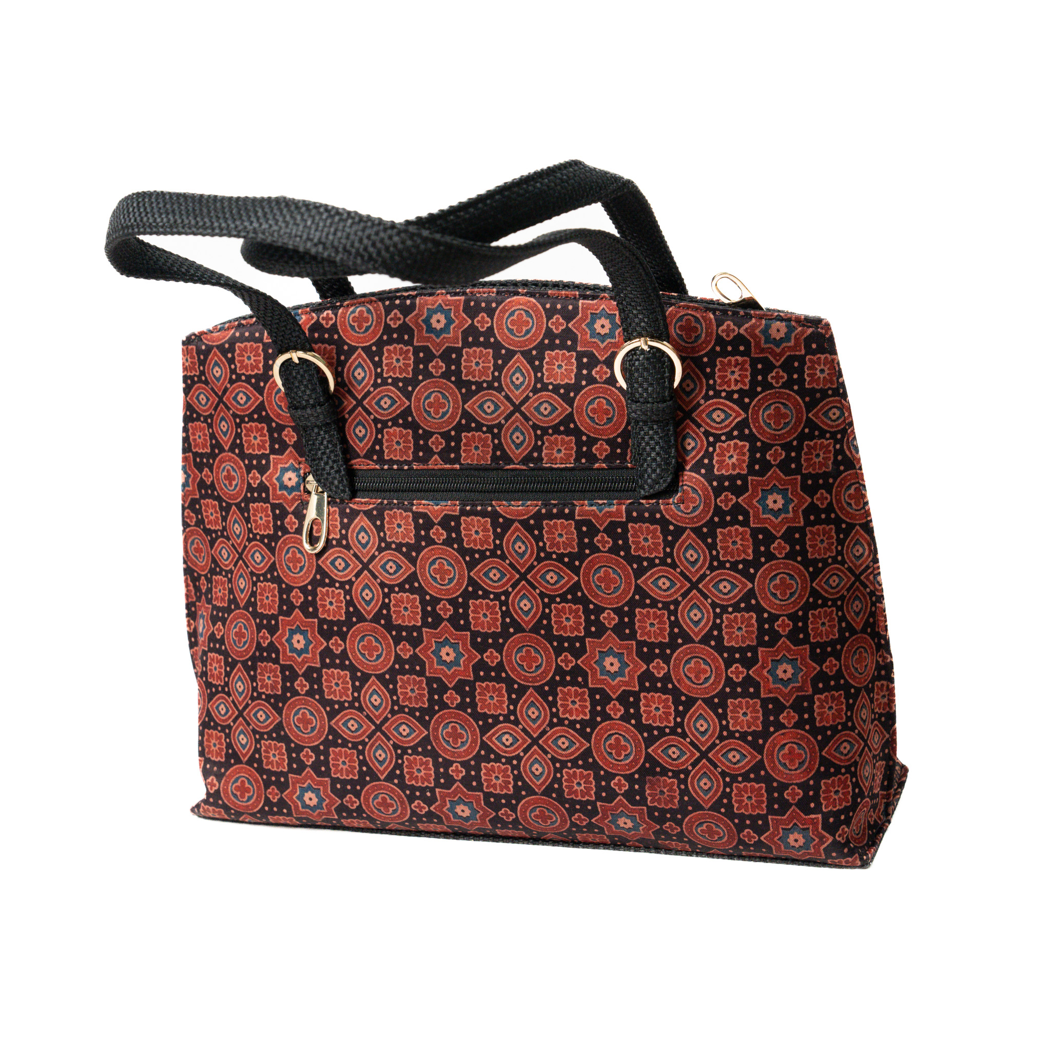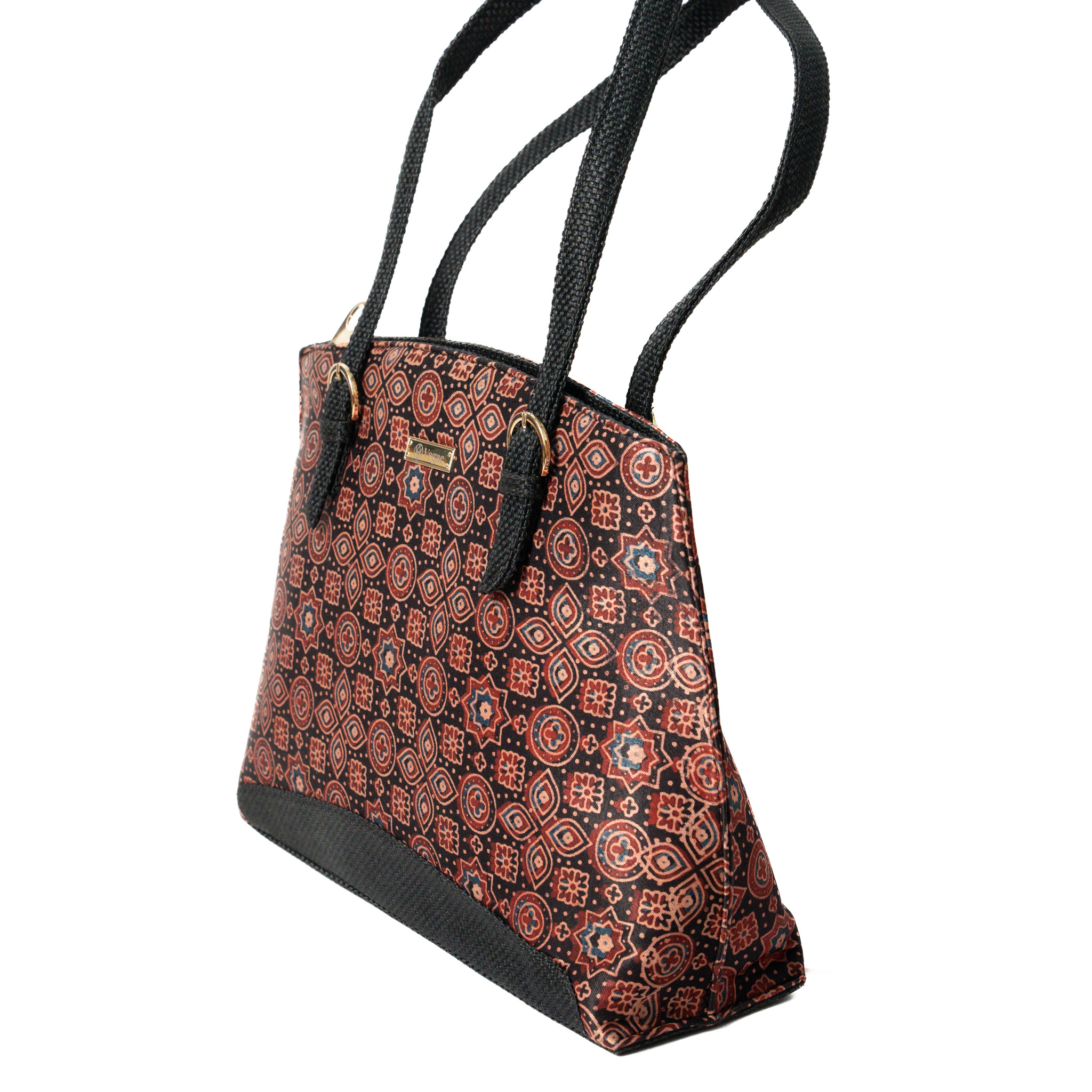 Satchel bags usually signify uber-luxurious fashion note. Vegac has taken it a notch higher by adding this unique block printed handwoven Mushru fabric by skilled artisans with premium quality jute. The rich sheen and the elegant floral print are an add on to your casual/party wear attire.