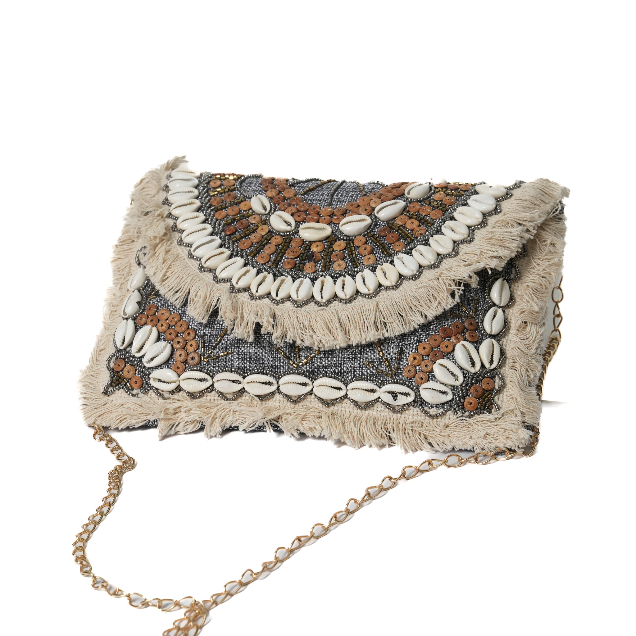 Add this bohemian accessories to your casual outfit to bring out the more fun and colorful side of you. This Grey boho clutch is sure to make heads turn with its chic look. It is made of high quality jute with intricate thread work and pompom patchwork which surely brightens up the whole look of this clutch. The overall look further enhances the feminine energy in you as these are decorated with cowrie shells and coins which symbolizes wealth and prosperity. All in one package!! Isn’t it!?