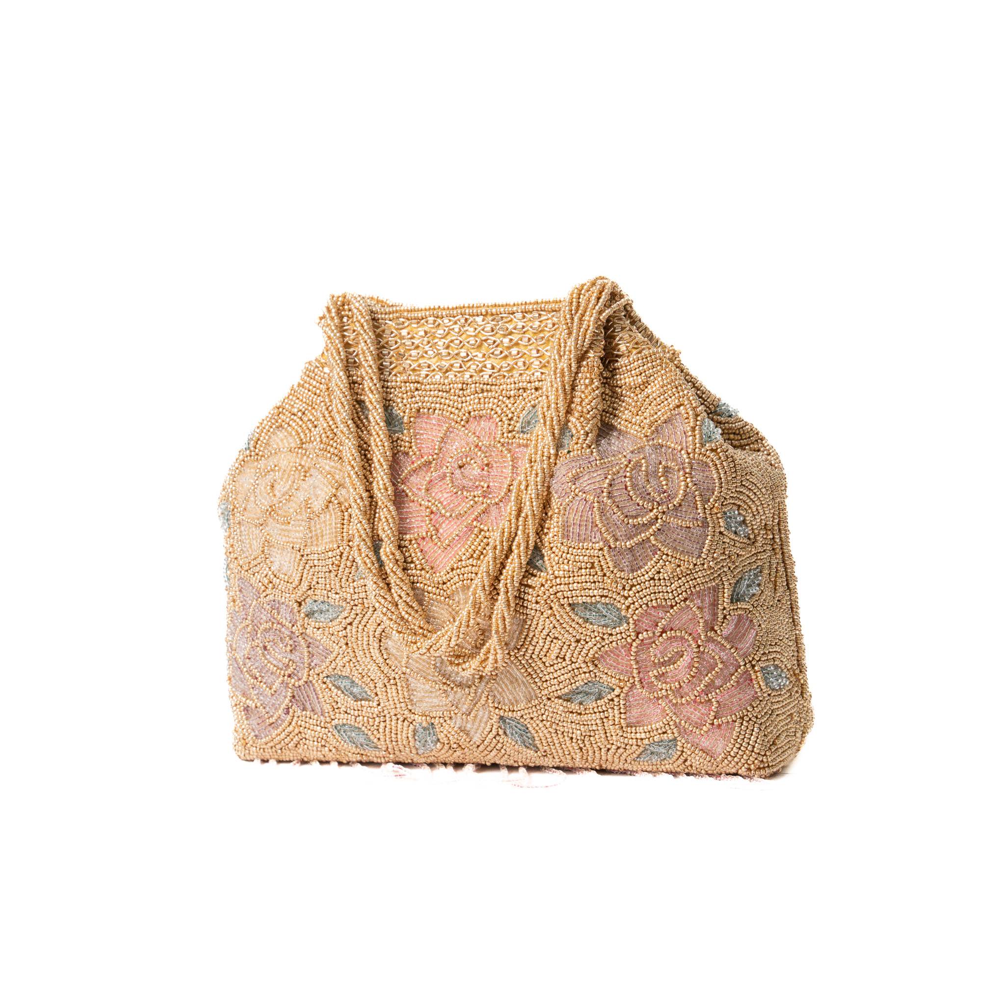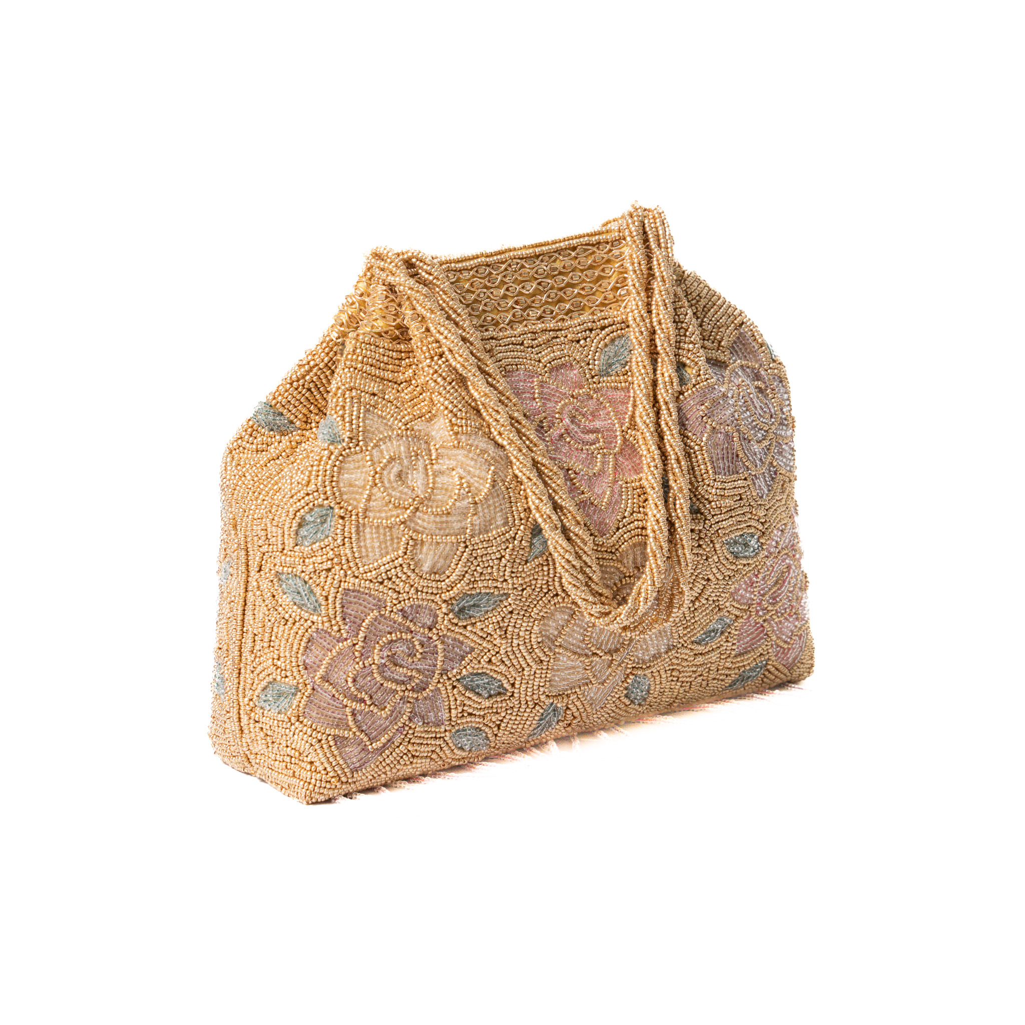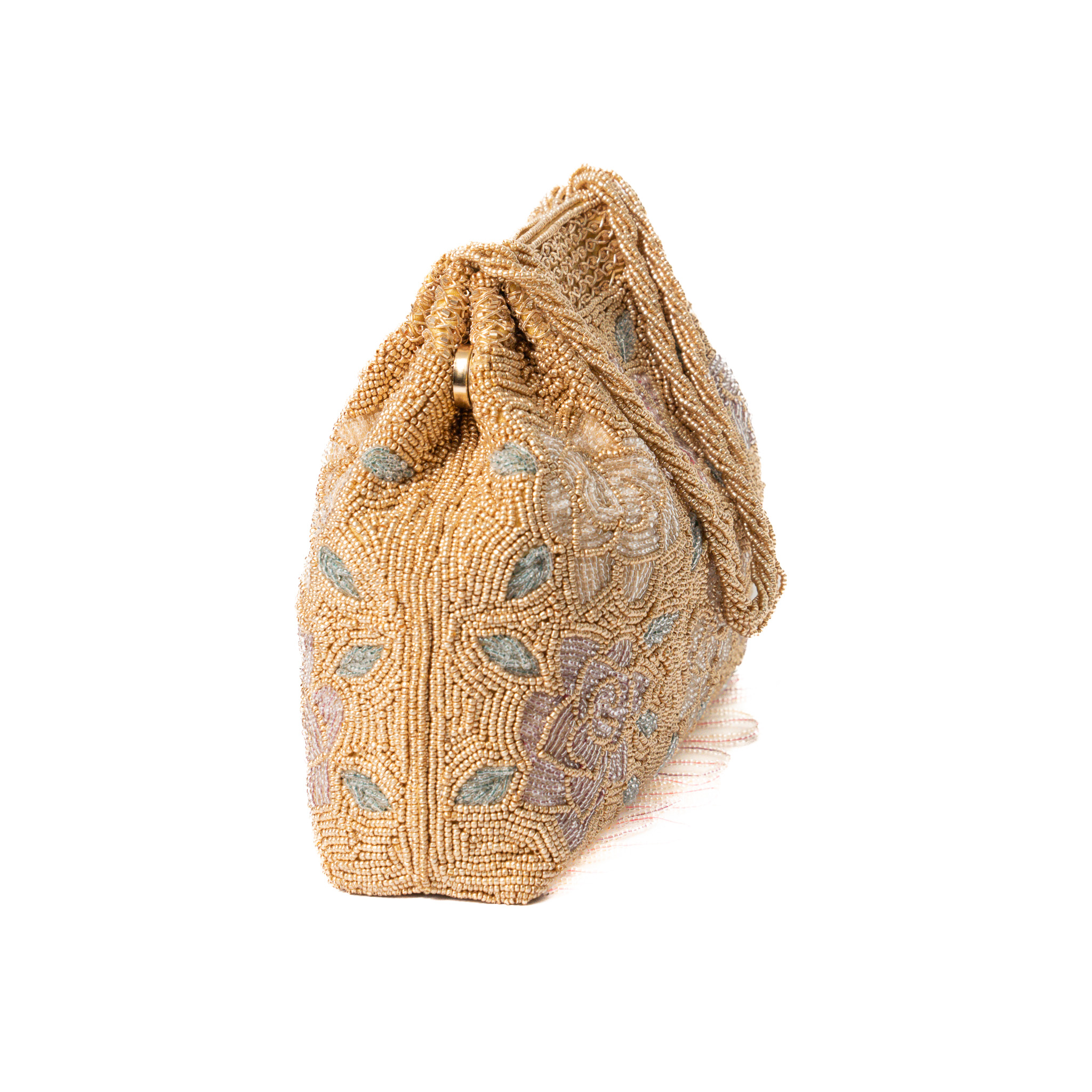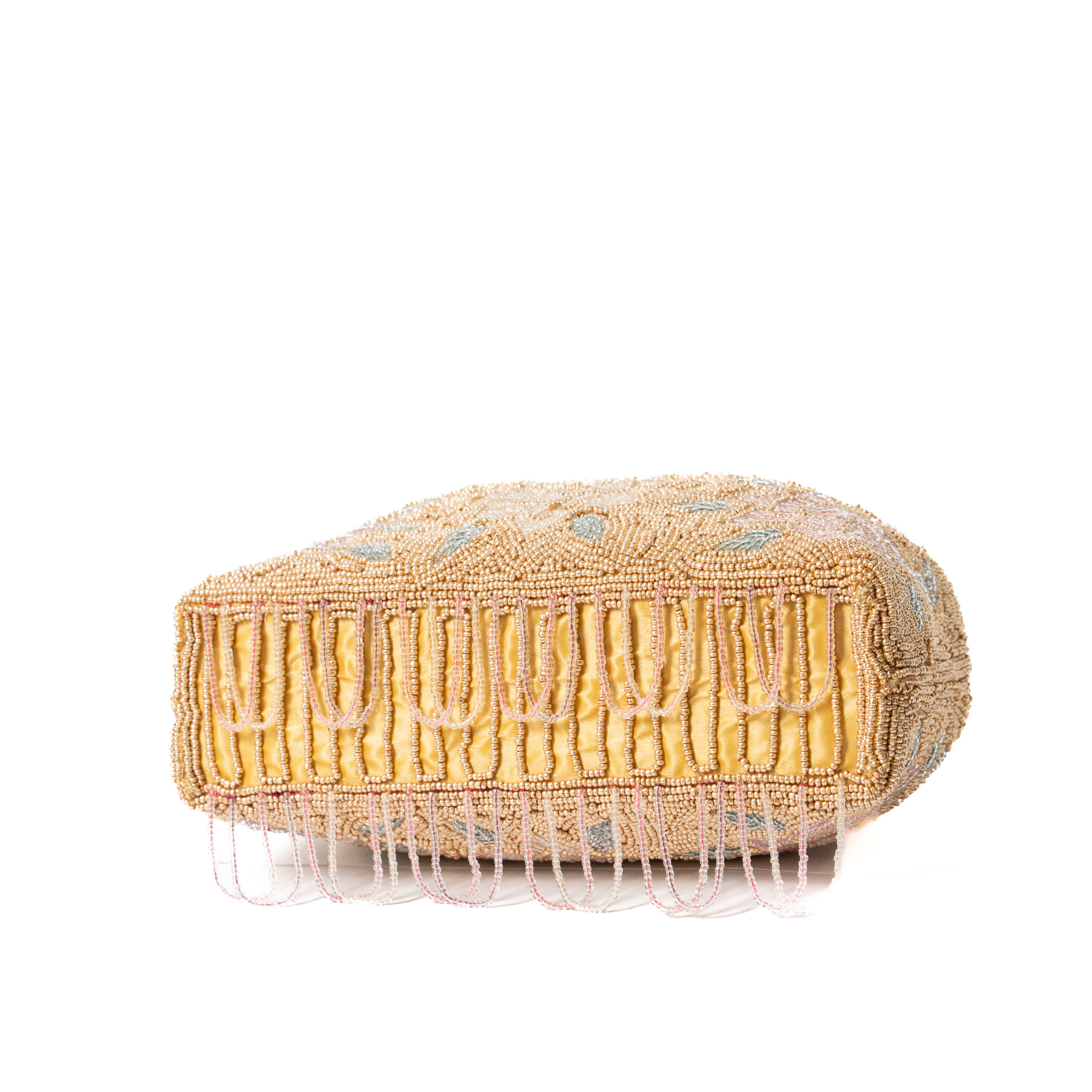 Multi color Pearl embroidery with hanging beads work basket Clutch – Gold