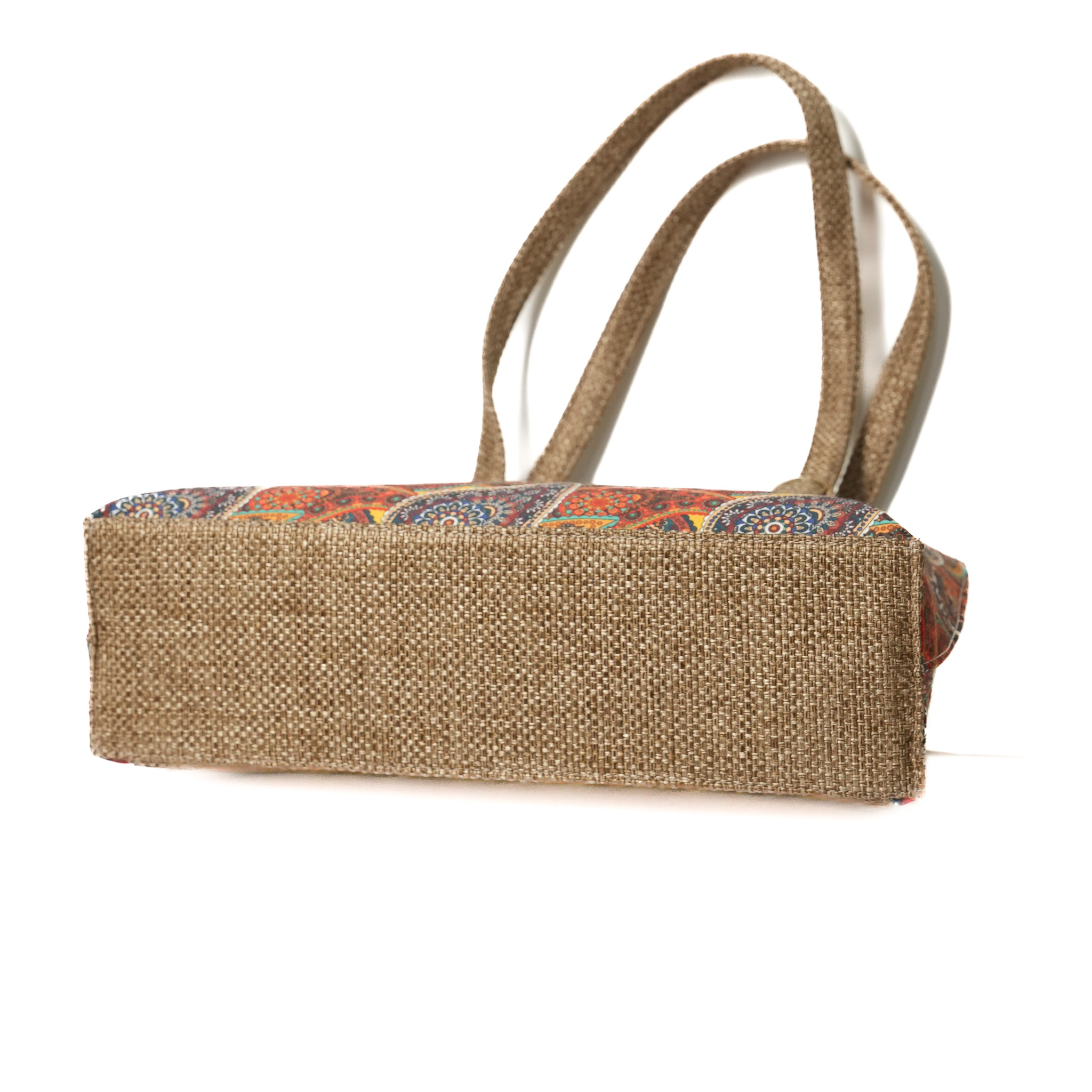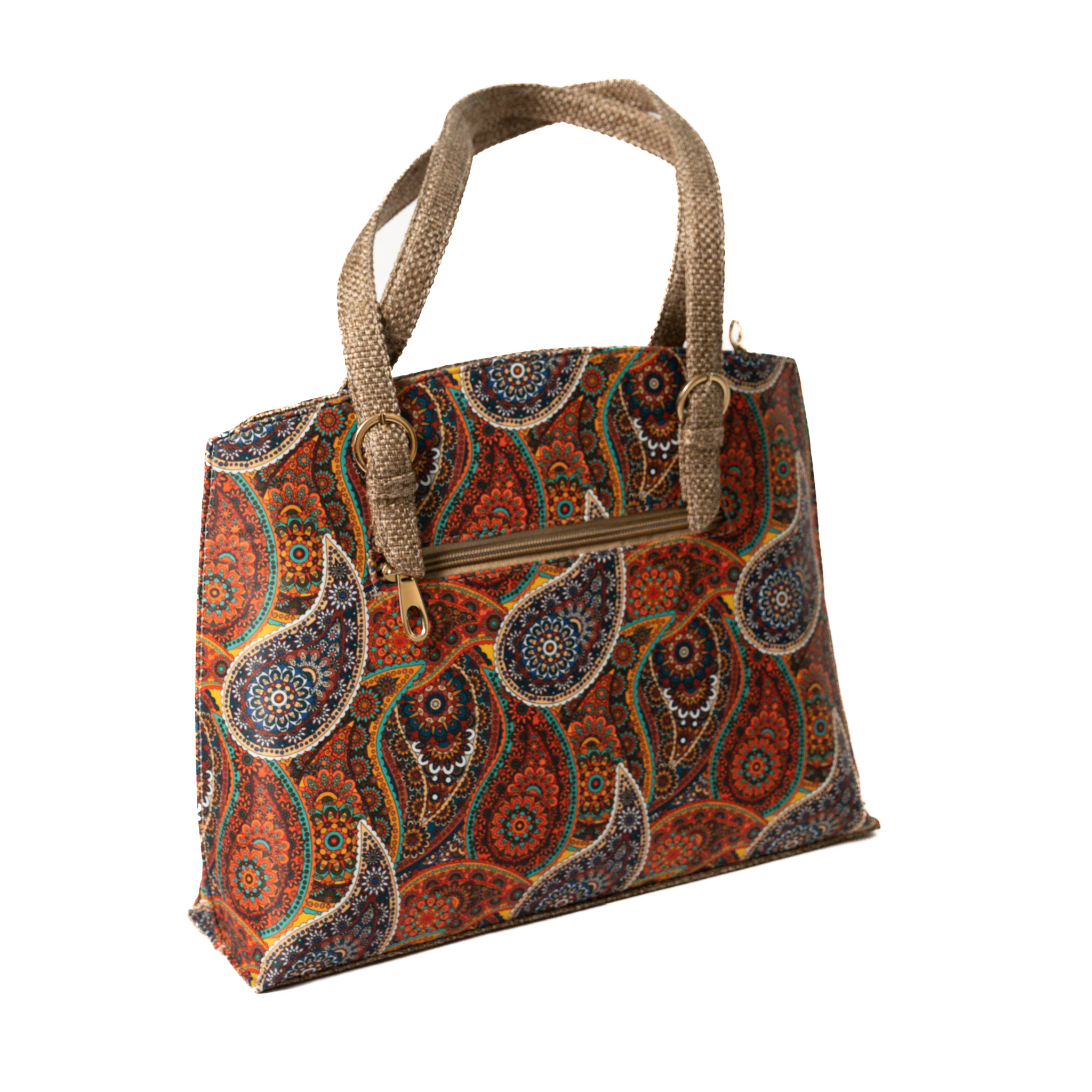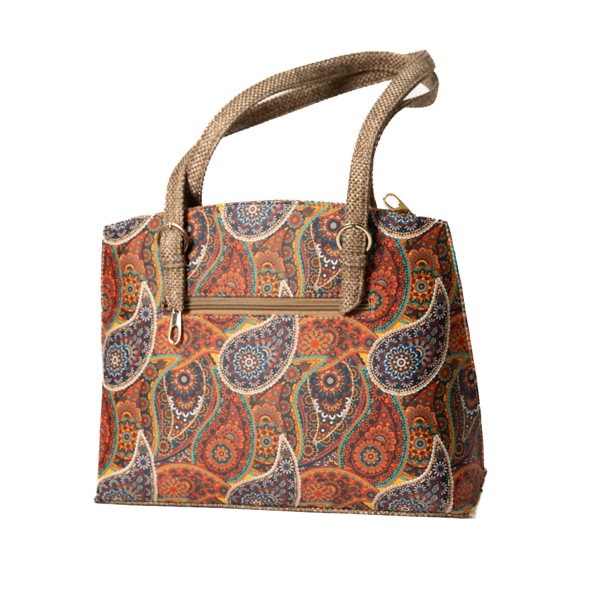 Satchel bags usually signify uber-luxurious fashion note. Vegac has taken it a notch higher by adding this unique Paisley digital printed Satin with premium quality jute. The rich sheen and the elegant paisley print are an add on to your casual/party wear attire.