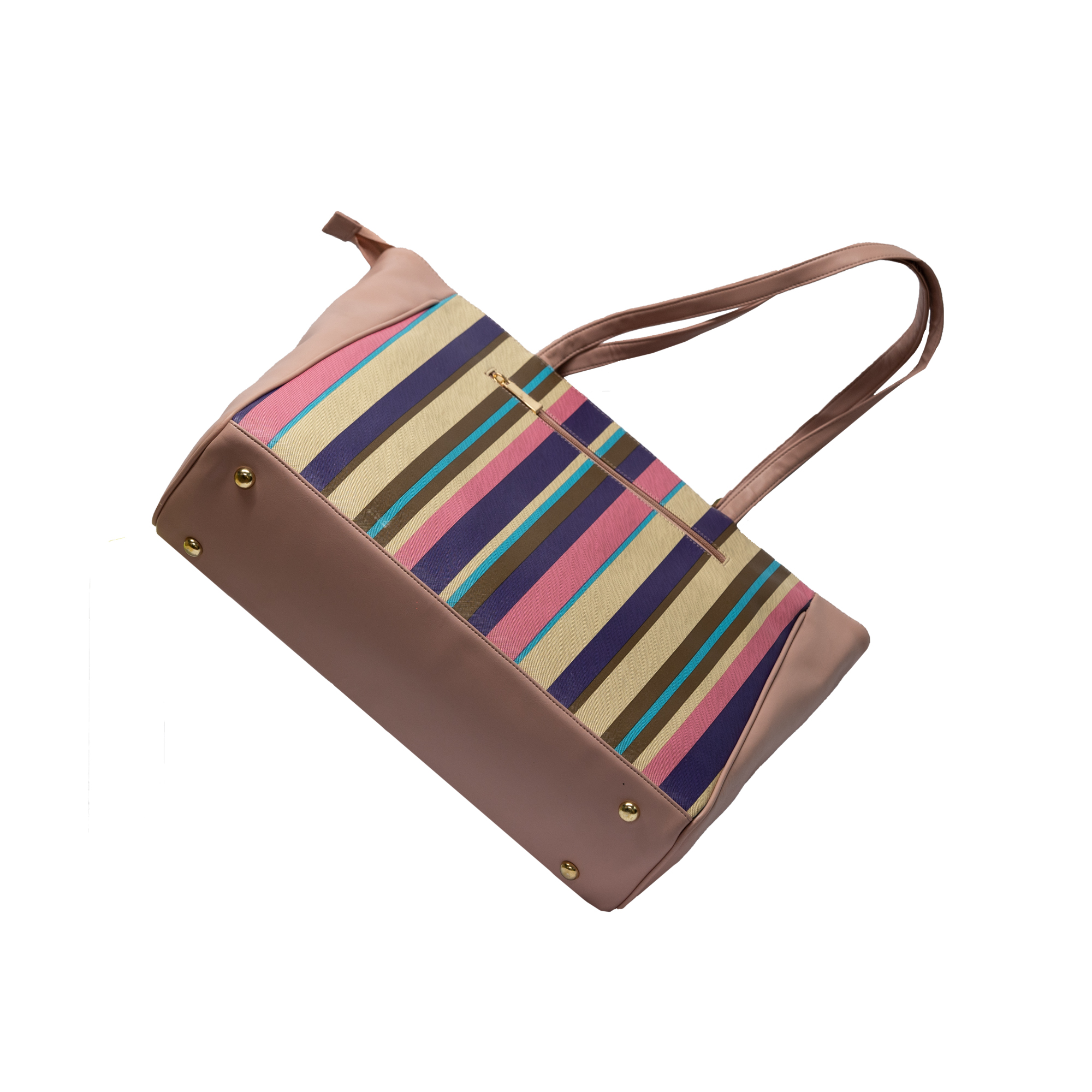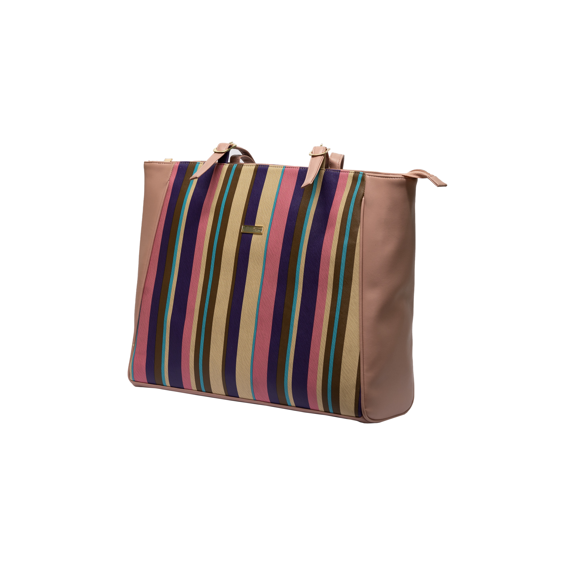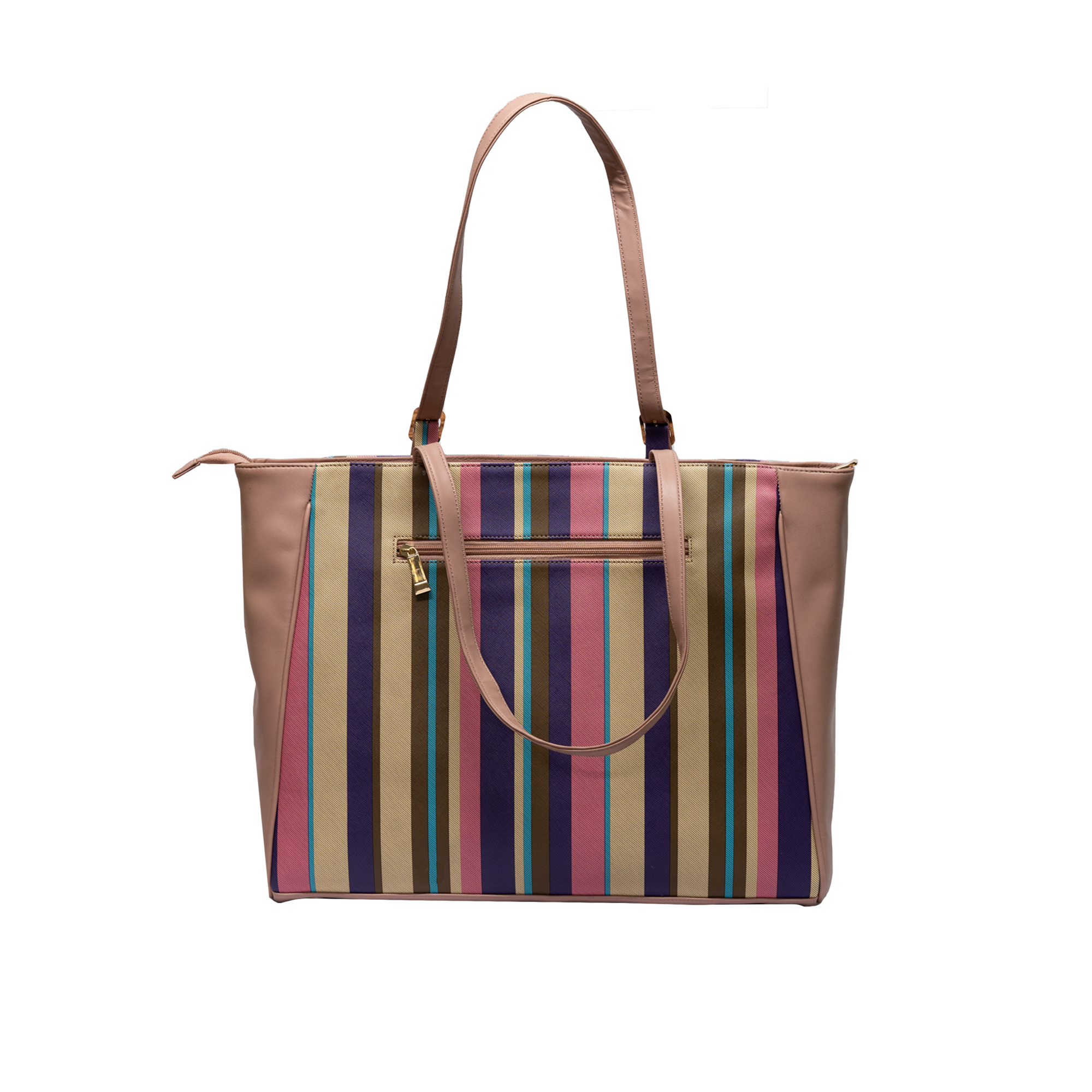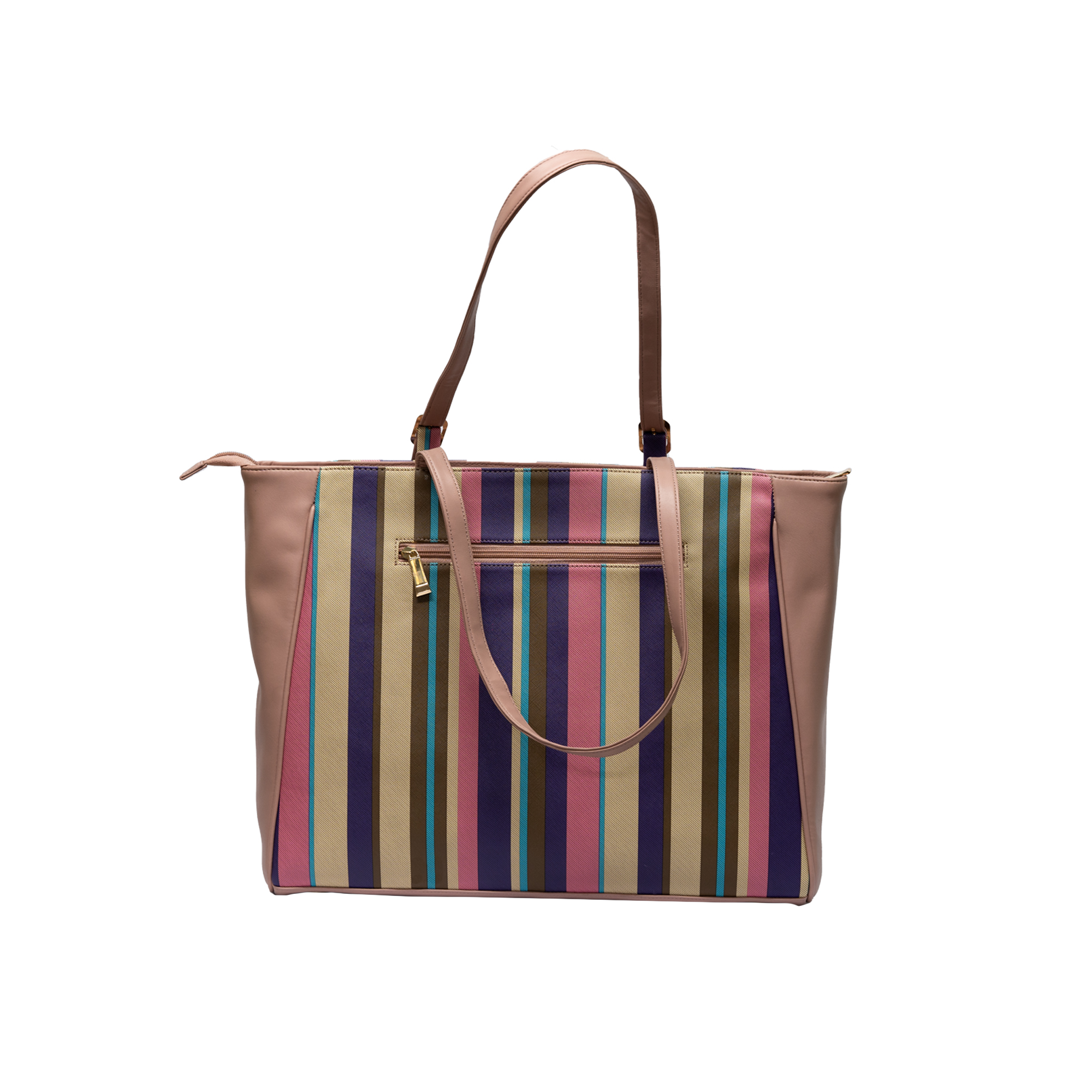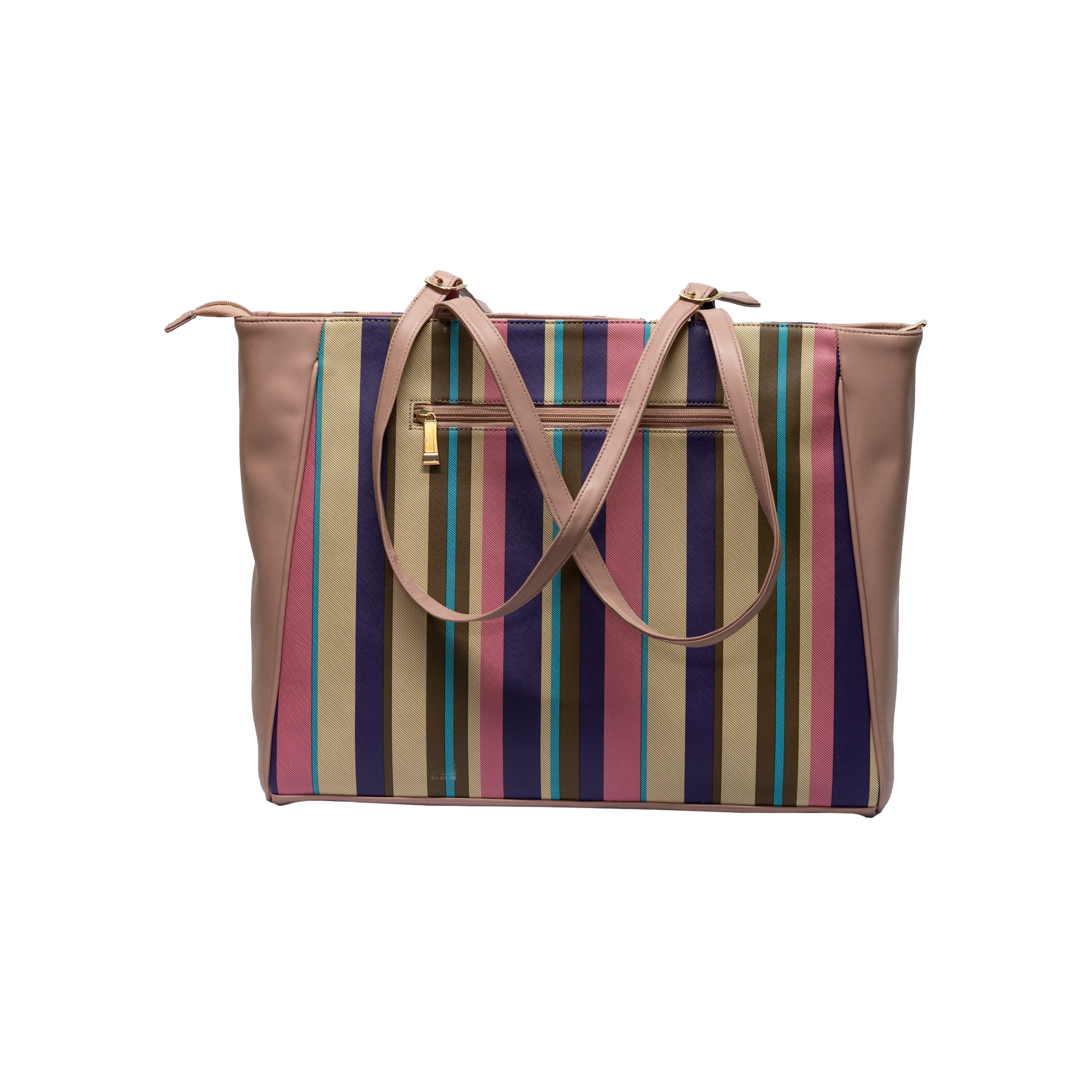 This chic everyday multicolors striped with pink base office shoulder bag houses your laptop and all essentials for the day. It has two spacious compartments, a seperate cushioned laptop compartment and organiser for phone, charger, pen, key holder,bottle holder, etc,.. It will be your favorite accessory to stay organized every day of the week.