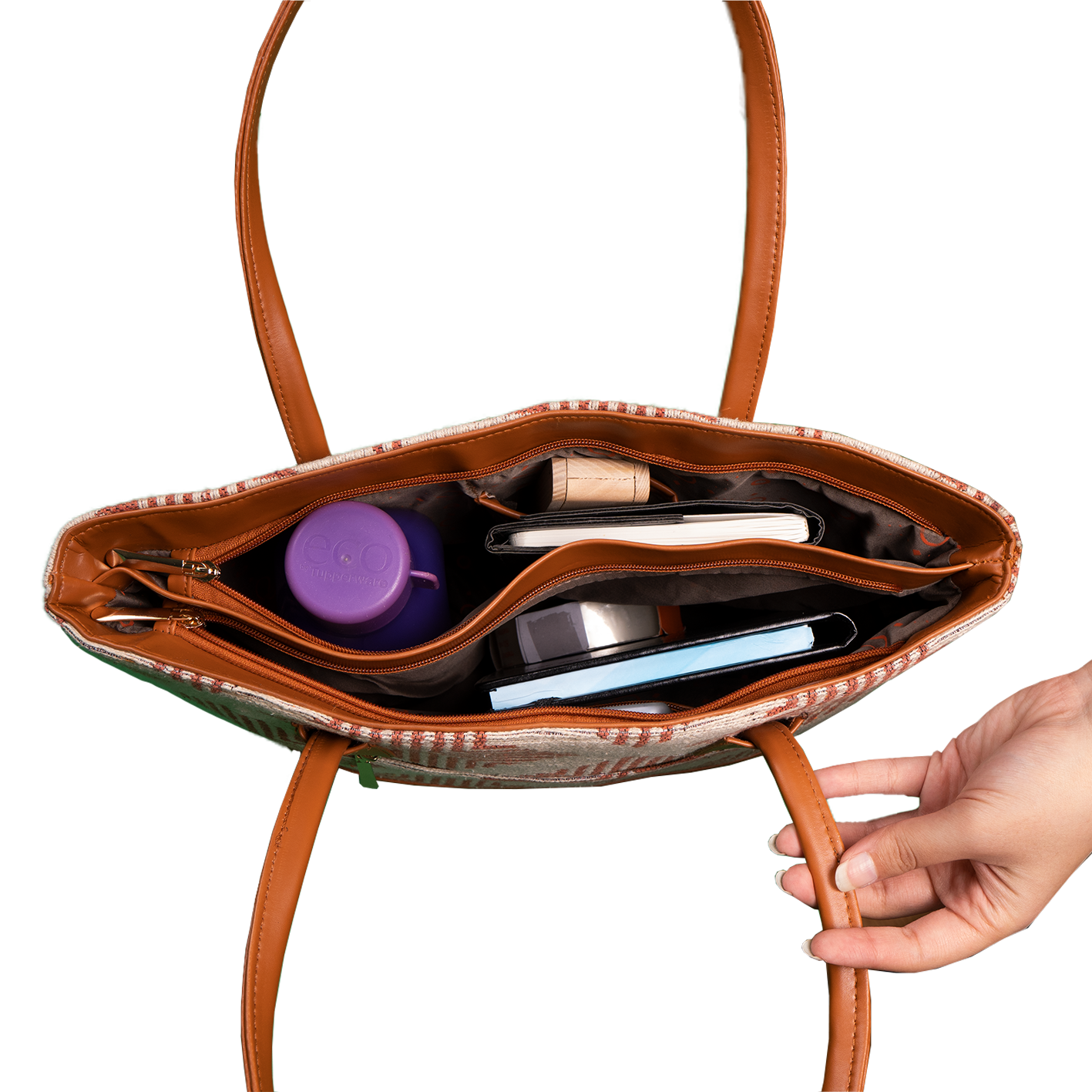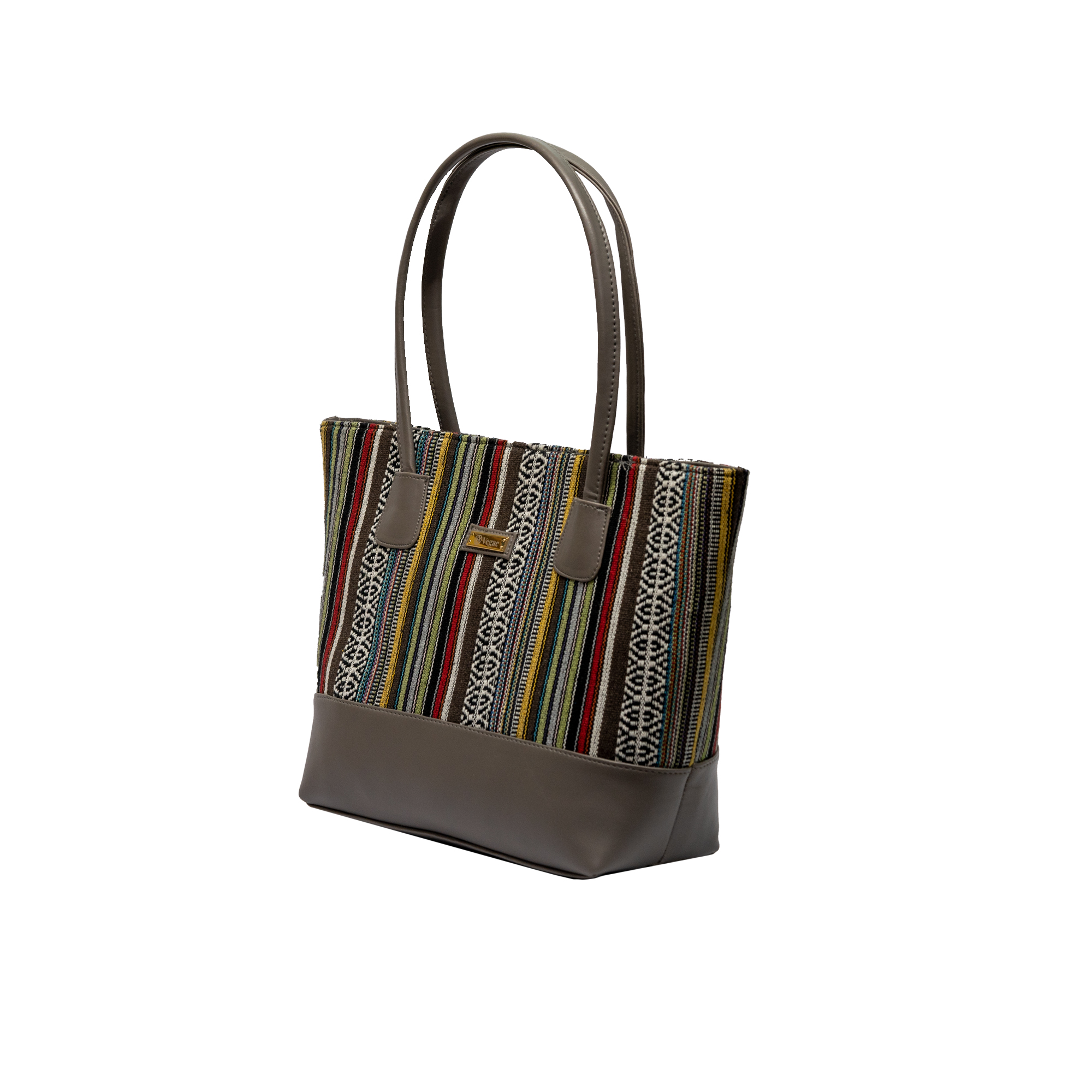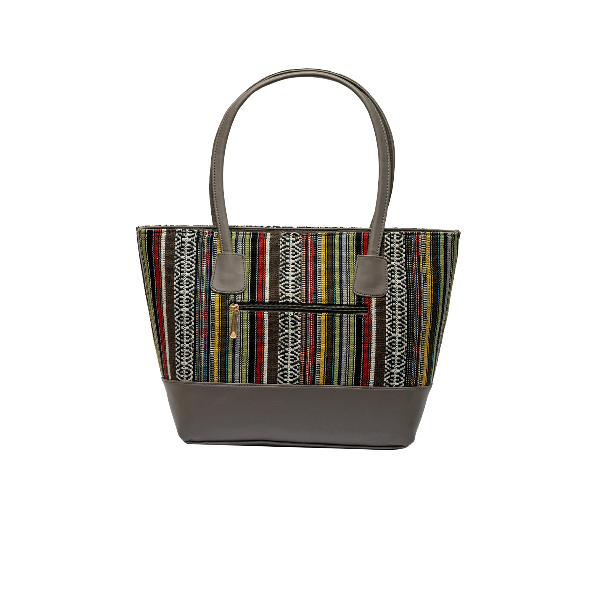 Add a touch of luxury to your bag collection with this multicolored striped tote bag with grey base. Cut from good quality jacquard fabric and vegan leather, it won’t stain or damage any item it is used on. It has two partitions to carry all your essentials. Love to take it wherever you go