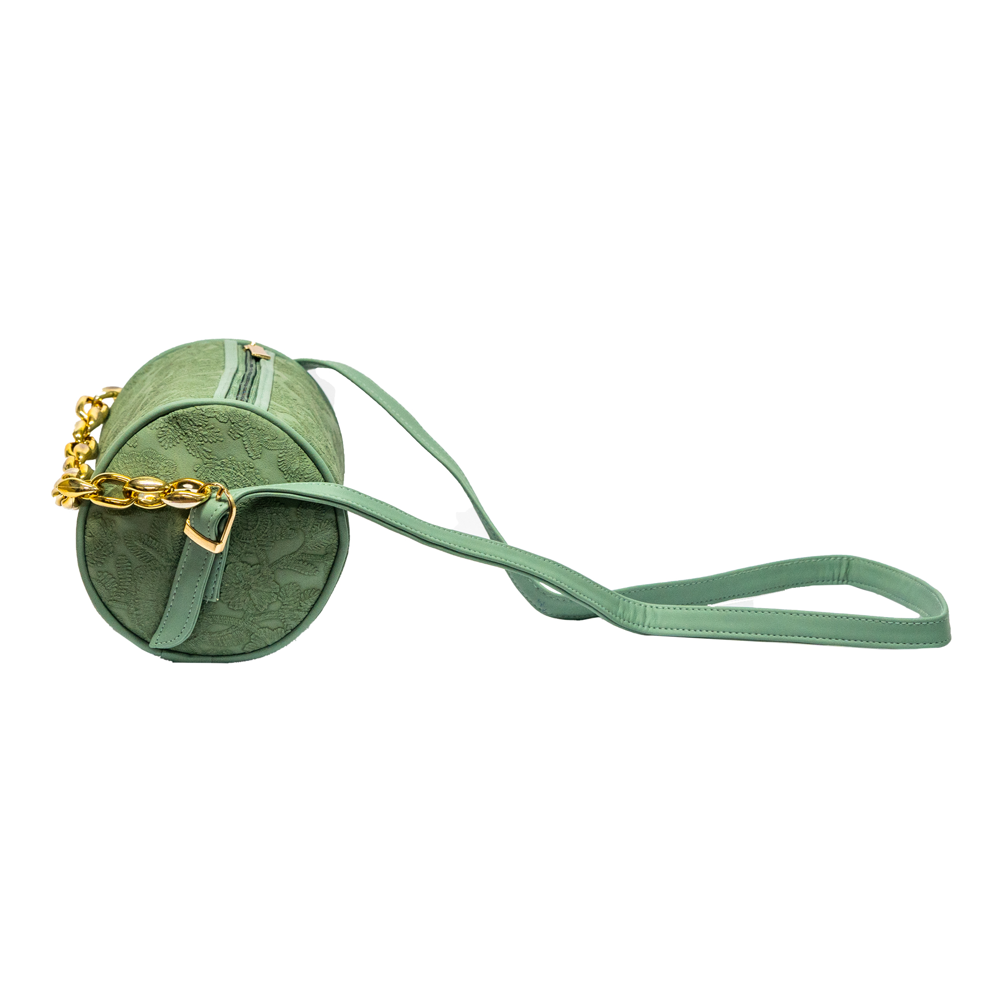 This self design pastel green round cylinderical sling bag is made from vegan leather adorned with a gold chain. It is made to last, designed to fit and stand out.