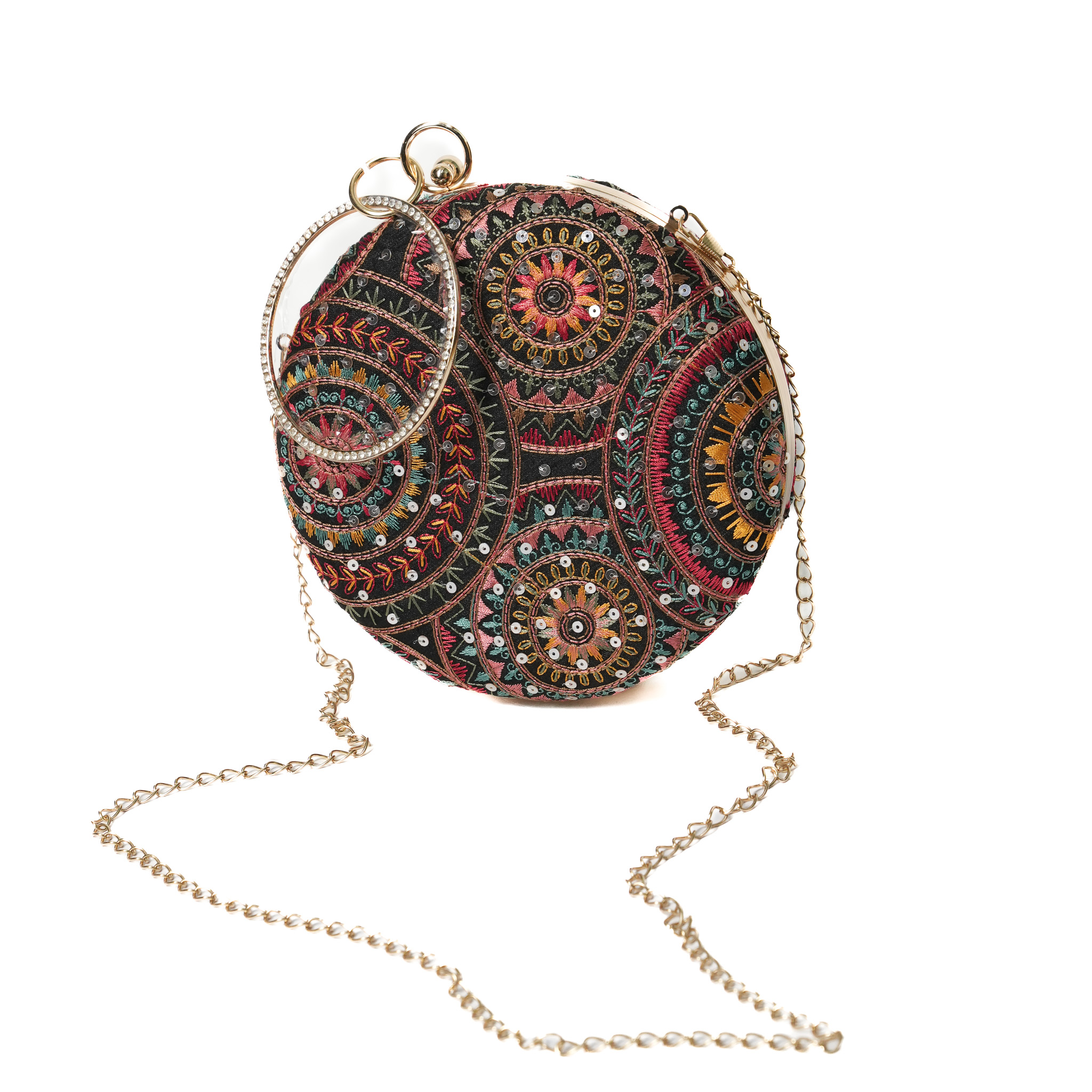 Don’t know where to keep your phone and makeup while dancing!? We have got the perfect round metal frame clutch with sequinned embroidery on cloth which highlights your hands and attire for a wedding/festival.
